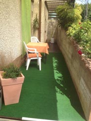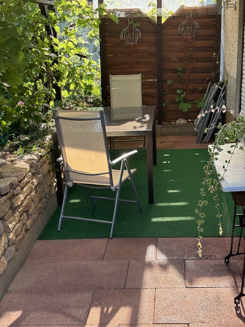 Neben dem separaten Eingang befindet sich auch die etwas kleinere Terrasse für das Appartement Silvaner, natürlich auch regensicher überdacht.