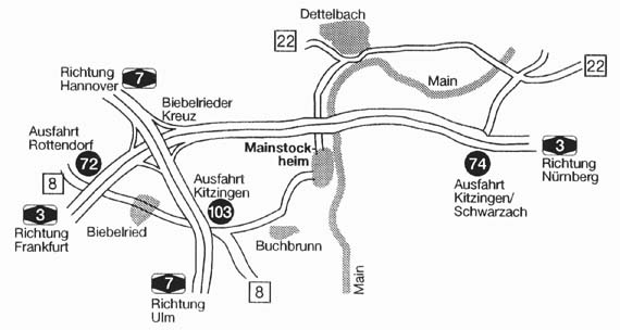 Nicht weit vom Biebelrieder Kreuz. Nur 5 Minuten von der Autobahn A 7 Hannover - Würzburg - Ulm oder nur 10 Minuten von der Autobahn A 3 Frankfurt - Würzburg - Nürnberg.