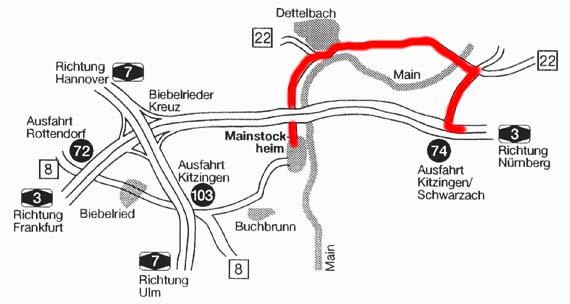 Rechts abbiegen Richtung Schwarzach/Dettelbach. Auf dieser Straße bleiben (Richtung Schweinfurt, Volkach, Bamberg), bis nach 1,6 km der Abzweig nach Würzburg auf die B 22 kommt. Jetzt sind es noch 4,8 km bis nach Dettelbach. In Dettelbach die zweite Straße nach der Aral-Tankstelle (Richtung Kitzingen) rechts und gleich wieder links nach Mainstockheim (3 km) fahren. In Mainstockheim auf der Hauptstraße bleiben bis zur Fußgängerampel. Am weißen Wegweiser "Riedbach" rechts den Berg hoch (ist schon der Mühlweg). Am Berg oben den ersten Abzweig nach rechts fahren, jetzt noch 150 Meter und Sie sind am Ziel.