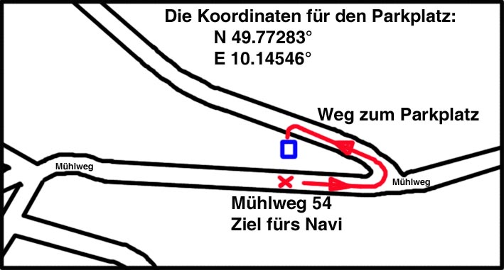 Das Navi findet - ganz richtig - den Mühlweg 54. Der Eingang ist aber, vom Mühlweg aus gesehen, hinter dem Haus. Da ist ein betonierter Flurbereinigungsweg ohne Namen. Deshalb können Sie diese Adresse nicht auf dem Navi eingeben. Sie müssen noch wie auf der Zeichnung, "um die Häuser" fahren, und schon sind Sie am Ziel.